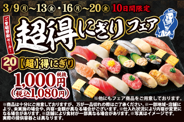 小僧寿しは3月9日~13日/3月16日~20日の期間限定で「【超】得プレミアムフェア」を開催する。