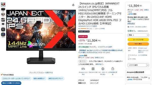 Amazon.co.jpにて、JAPANNEXTの24.5型ゲーミングディスプレー「JN-i245G144F【Amazon.co.jp限定】」が販売中だ。過去価格は1万4380円だが、タイムセールにより20%の1万1504円で購入できる(3月9日時点)。