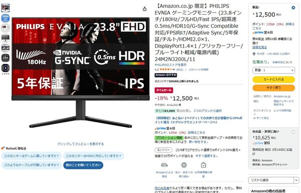 Amazon.co.jpにて、PHILIPSの23.8型ゲーミングディスプレー「24M2N3200L/11」が販売中だ。参考価格は1万5273円だが、タイムセールにより18%の1万2500円で購入できる(3月9日時点)。