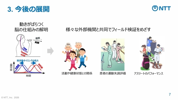 NTTでは、筋電図などを用いずにタイミングの乱れが計測できる前述の円運動の手法などを活用して、多様な外部機関と共同でフィールド検証を続けていく予定だ。