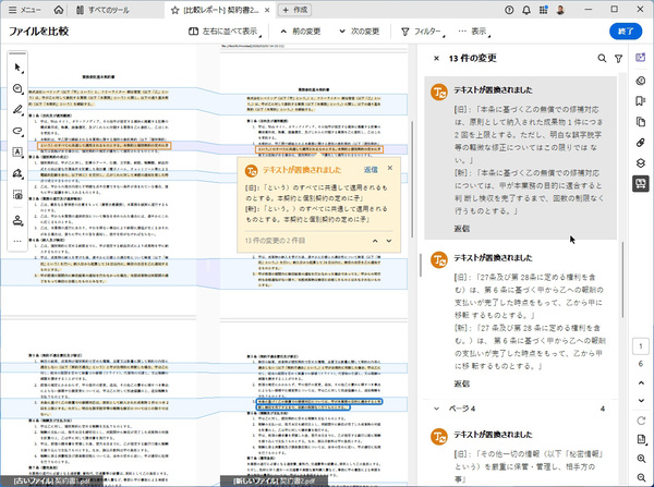 単なる文書比較ではなく、重要な変更点を示し、アドバイスも得られる