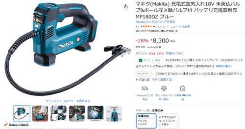 マキタの「充電式空気入れ(MP180DZ)」がAmazonで割引対象。参考価格11,500円のところ、28%オフの8,300円で販売中。