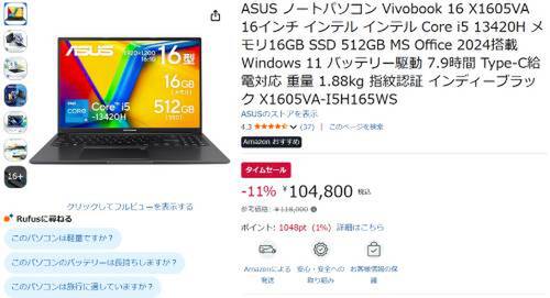 ASUSのノートPC「Vivobook 16(X1605VA-I5H165WS)」がAmazonタイムセール対象。参考価格118,000円のところ、11%オフの104,800円で販売中。