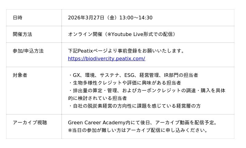 ネイチャーベースのカーボンクレジット創出・販売事業を展開するGreen Carbon株式会社(代表取締役:大北潤、以下Green Carbon(グリーンカーボン))は、大阪ガス株式会社(代表取締役社長:藤原正隆、以下「大阪ガス」)、と共催し、「生物多様性×カーボンクレジットオンラインセミナー(以下:本セミナー)」を2026年3月27日(金)13:00~14:30で開催する事をお知らせします。