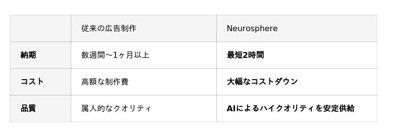 Neurosphereは、広告クリエイティブ制作を手始めに、年内に以下を含む約300のAIサービスを順次展開してまいります。