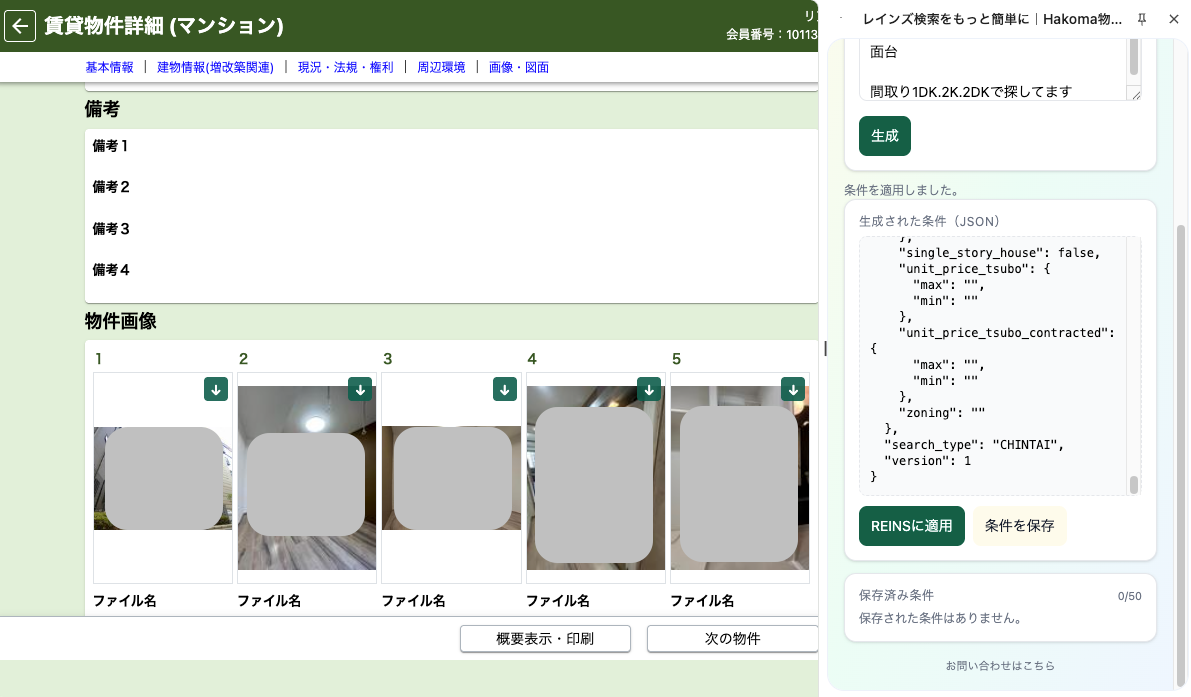 不動産仲介業では、顧客の希望条件に合う物件を探すためにREINSを日常的に利用します。しかし、REINSの検索フォームは所在地・路線・駅・間取り・賃料・面積・築年数・設備条件など数十の入力項目があり、1回の検索ごとに多くの手作業が発生します。