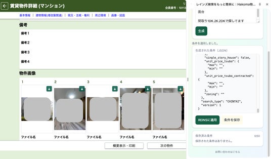 生成された検索条件は、ボタン1つでREINSの検索フォームに自動入力されます。手入力のミスや入力漏れを防ぎ、検索作業の時間を大幅に短縮します。