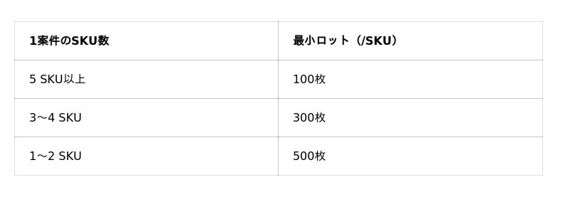 新しい最小ロットは、1案件あたりのSKU数に応じて以下の通りです。
