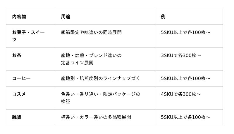 5SKU以上で最小100枚/SKUまで対応し、従来の「1SKUあたり最小500枚」から、SKU数が増えるほど最小ロットが下がる設計へ変更します。