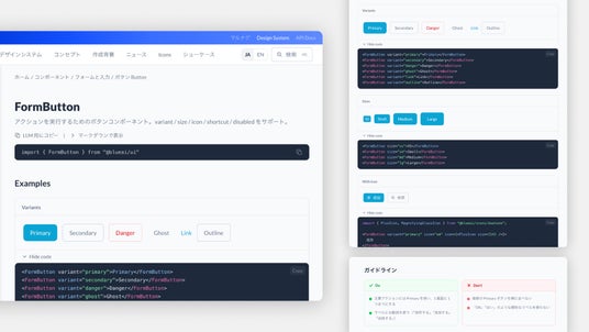ボタン・テーブル・モーダル・フォーム入力・データ表示など、業務アプリケーションに必要なUIコンポーネントを70種類以上収録。各コンポーネントにはライブプレビュー・Props一覧・コード例・使用ガイドライン(Do's & Don'ts)を掲載しています。