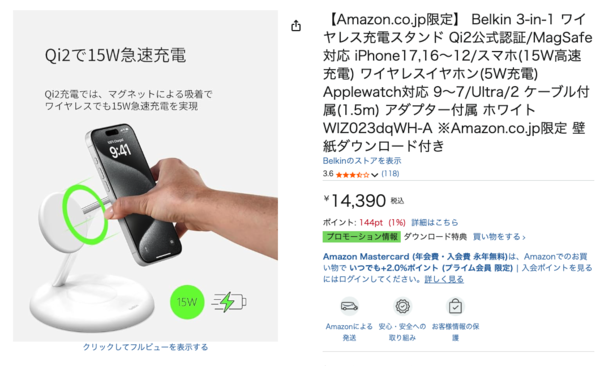 iPhoneやApple Watch、ワイヤレスイヤホンを1台で充電できる「Belkin 3-in-1 ワイヤレス充電スタンド(Qi2公式認証/MagSafe対応)」がAmazonで販売中だ。価格は14,390円。