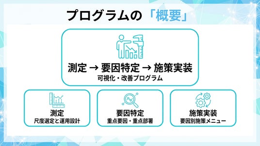 本プログラムは、プレゼンティーイズムを測定し、要因を特定し、要因別施策を実装して効果検証まで回す可視化・改善支援です。