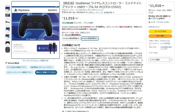 Amazon.co.jpにて、「【純正品】DualSense ワイヤレスコントローラー ミッドナイト ブラック + USBケーブル for PC」が販売中だ。価格は1万1016円。