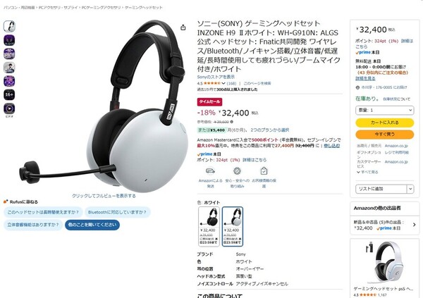 Amazon.co.jpにて、ソニーのゲーミングヘッドセット「INZONE H9 Ⅱ ホワイト」が販売中だ。参考価格は3万9600円だが、タイムセールにより18%オフの3万2400円で購入できる(3月10日時点)。