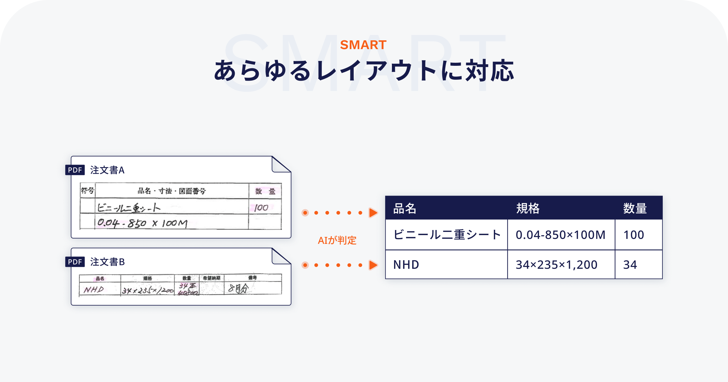 - 統一フォーマット生成: 縦型PDF、手書きメモなど、あらゆるレイアウトを解析し、1つの統一フォーマットに変換