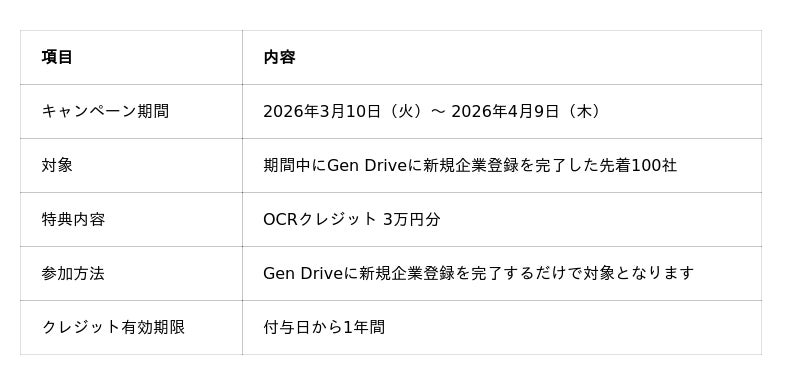 Gen Driveのリニューアルを記念し、新規ご登録企業を対象としたキャンペーンを実施いたします。