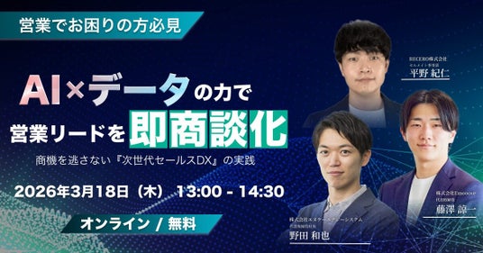 新時代の営業手法を提案する株式会社Emooove(本社:東京都品川区、代表取締役CEO:藤澤諒一)は、営業部門の責任者・担当者を対象としたウェビナー『AI×データの力で営業リードを即・商談化! 商機を逃さない「次世代セールスDX」の実践』を、2026年3月18日(水)にRECERO株式会社、株式会社エヌケーエナジーシステムと合同で開催いたします。