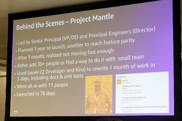 ここでの効果は劇的だった。「当初1ヶ月かかると思われたコードのリライト作業は、Q DeveloperとKiroを用いることで、わずか3日で終わってしまった。ドキュメント化やユニットテストを含めてだ」とバー氏はアピール。週のコミット数は2から40へ増加したため、単純に生産性は20倍になった。もちろん、名うての開発者たちが集まり、途中で増員したという背景もあるが、結果として1年かかると思われたプロジェクトは76日で完了にまで至ったという。