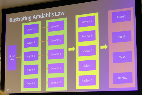 ただ、AIエージェントを並列で動かすことで、コードのコミットが向上しても、プロジェクト全体が高速化するわけではない。コードのマージやビルド、デプロイなど一連のCI/CD、テストやレビューなども高速化しないと、ボトルネックは解消しない。このボトルネックの課題に関しては、メインフレーム時代の「アムダールの法則」から指摘されている。「AIと同じスピードが必要になる。そうしないとボトルネックになる。コードプロセスだけを早くしても、スピードは十分ではない」とバー氏は指摘する。