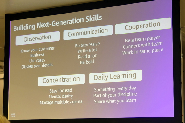 「開発者はジェネラリストになっていく。小さなチームが前提となり、場合によっては一人のチームもありえる」と語るバー氏。こうした中、バー氏は次世代に求められる5つのスキルを挙げる。顧客のビジネスや要件を「観察する能力」、AIや人との対話のために、とにかく書き、とにかく読む「コミュニケーション能力」、チームメンバーと共同作業できる「協調能力」、複数のエージェントを管理しながらフォーカスをぶらさない「集中力」、つねに学び、学んだことを共有する「日々の学び」の5つだ。