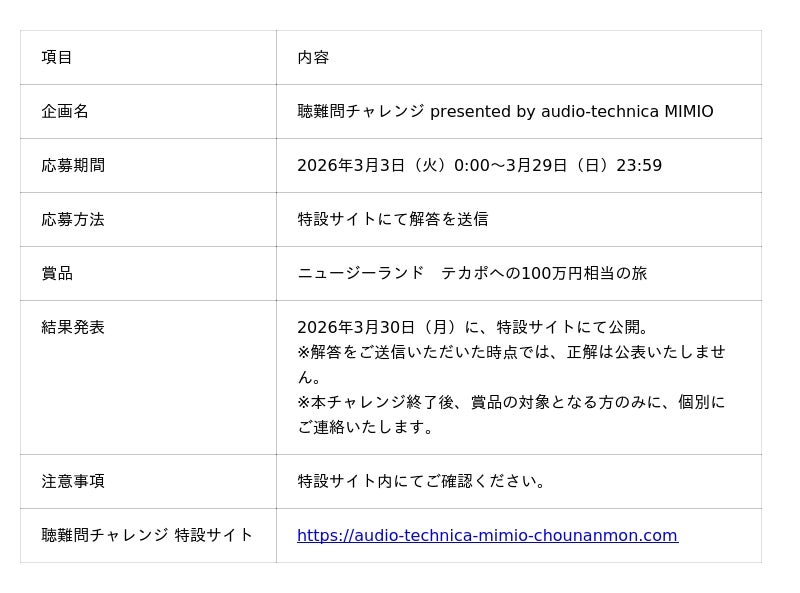 株式会社オーディオテクニカ(本社:東京都町田市、代表取締役社長:松下和雄)が展開する、聴こえをサポートするブランド「audio-technica MIMIO(オーディオテクニカミミオ)」は、現在開催中の音声体験型謎解きクイズ「聴難問チャレンジ」において、3月10日(火)よりヒントを特設サイト上で公開いたしました。