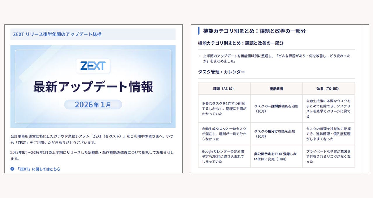 「ZEXT」は、2025年5月のβ版提供時より一貫して、会計事務所の運営における困りごとに徹底的に寄り添ってきました。営業担当による伴走支援サポートも手厚く行い、実際のユーザーの声をタイムリーに反映し、正式リリース後は6カ月で50個以上の大小さまざまな機能アップデートをきめ細やかに実施しています。