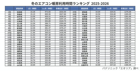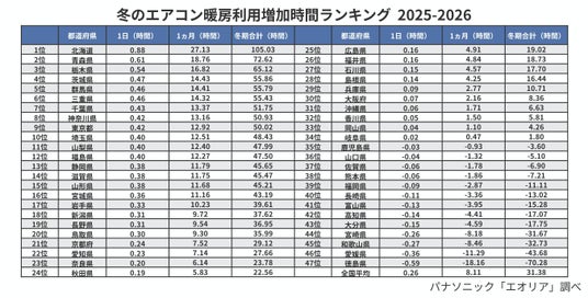 パナソニックは、エオリア アプリに接続したエオリアユーザーの利用データをもとに、今冬(2025年11月~2026年2月)のエアコン暖房利用時間と利用増加時間(平年差)を、それぞれ算出しました。