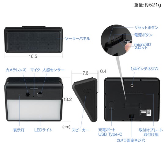 本製品はソーラーパネル一体型設計を採用した防犯カメラです。電源工事や配線が不要なため、玄関や駐車場、勝手口などの屋外スペースに手軽に設置できます。内蔵バッテリーを搭載しており、日中に太陽光で充電することで夜間の監視を継続。USB Type-Cによる充電にも対応しているため、日照条件が十分でない場所でも柔軟に運用できます。