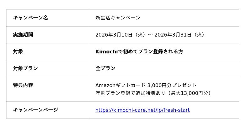 公認心理師によるオンラインカウンセリング「Kimochi」は、2026年3月10日(火)から3月31日(火)までの期間、初めてプラン登録される方を対象に、最大13,000円分のAmazonギフトカードをプレゼントする「新生活キャンペーン」を開始いたします。