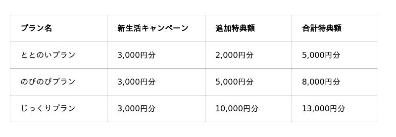 年割プランをご登録いただいた場合、基本特典の3,000円分に加えて、プランに応じた追加特典をお届けします。