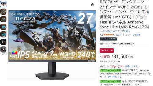 REGZAのゲーミングモニター「RM-G276N」がAmazonタイムセール対象。参考価格50,600円のところ、38%オフの31,500円で販売中。