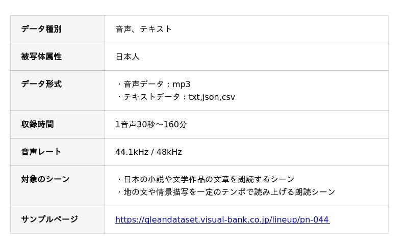 Visual Bank株式会社は、高品質な音声合成(TTS)モデルの学習や自動音声認識(ASR)の精度向上、および自然言語処理(NLP)の研究に最適化された、「日本語・1話者の文学朗読音声データセット」の提供を開始します。