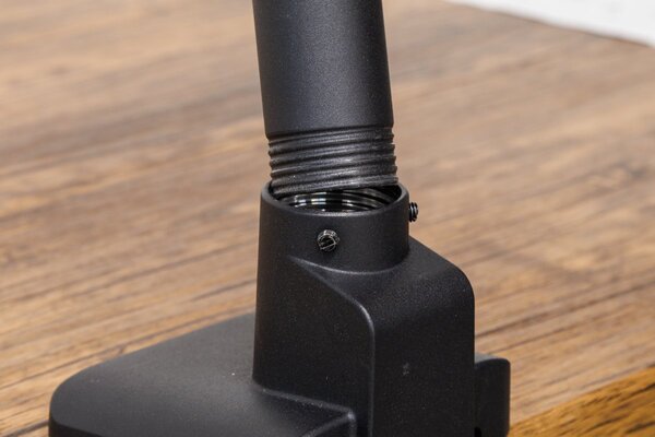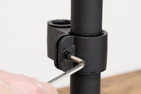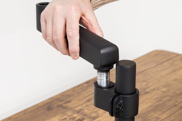 まずは、スタンドをデスクにクランプで固定し、そこにポールを立てて、こちらもネジで固定する。続いて、ポールとアームを接続するホルダーを装着し、2本のアームを順に差し込んでから、ネジを締めて抜け止めをする。