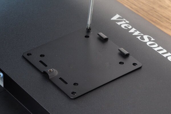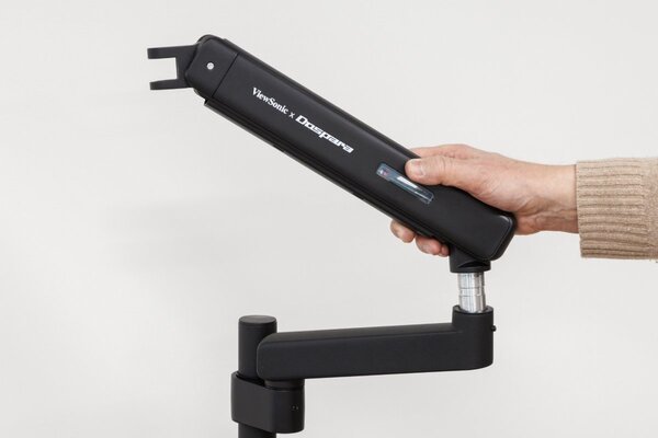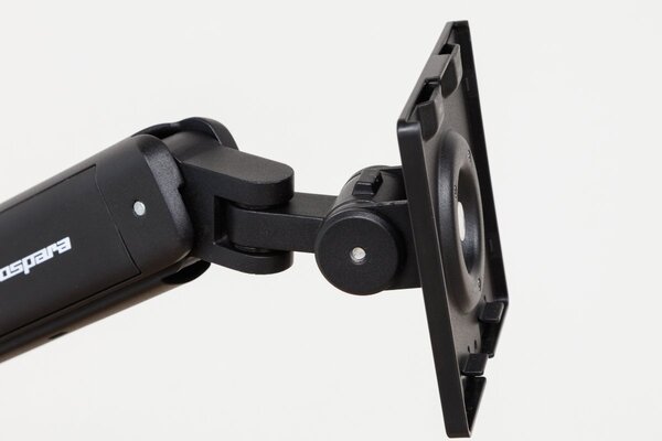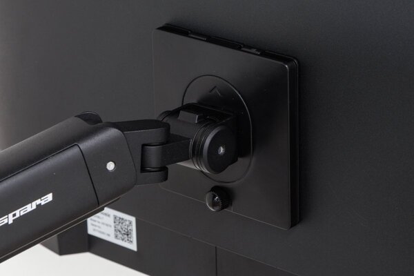 続いて、アームの先端にディスプレーへの取り付け部を装着し、ディスプレーのVESAマウントにはプレートを固定する。そして、ディスプレーを持ち上げて、背面のプレートにアームの取り付け部にはめて、手回しネジで固定すれば完成だ。