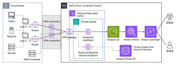 オンプレミスとクラウド間の通信を、インターネットを経由しないプライベートネットワーク内で完結させる場合、このように AWS サービス の DNS 名の名前解決を考慮したシステム構成が必要になります。