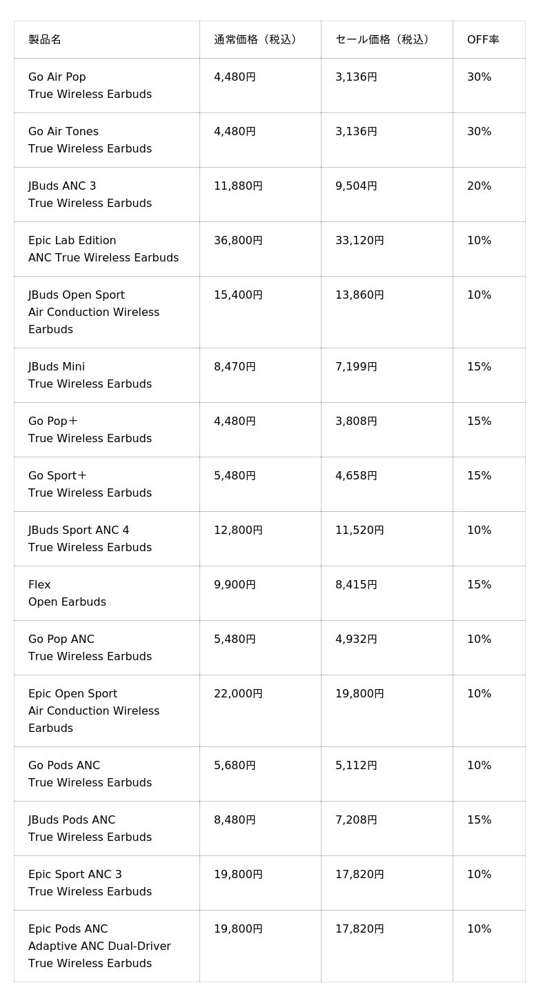 2024年度に100ドル以下のスポーツイヤホンと50ドル以下のワイヤレスイヤホンのカテゴリーで全米売上No.1(※1)を獲得した「JLab」の日本法人、JLab Japan株式会社(本社:東京都港区、代表取締役:横張 亮輔)は、2026年3月11日(水)12:00~2026年3月30日(月)23:59まで、JLab日本公式サイト(公式通販)にて、公式サイト開設4周年を記念した特別セールを開催いたします。