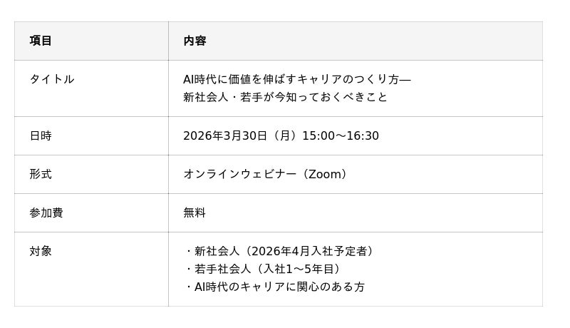 第1弾は新社会人・若手向け「AI時代に価値を伸ばすキャリアのつくり方」を3月30日に開催