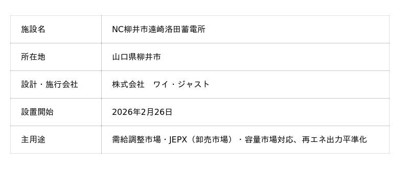 【日本蓄電池株式会社】山口県柳井市にて系統用蓄電施設「NC柳井市遠崎洛田蓄電所」蓄電池設置開始