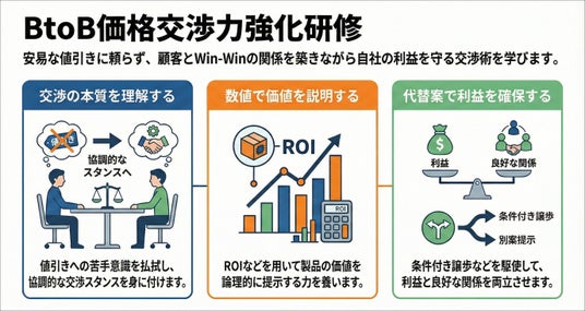 BtoB営業の利益を守る「BtoB営業向け 価格交渉力強化研修」をリリース。ROI等の数値を用いた論理的な価値訴求スキルを習得:社員研修のリスキル