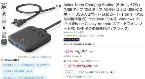 Ankerの充電ステーション「Nano Charging Station(6-in-1, 67W)」がAmazonで割引対象。参考価格6,990円のところ、10%オフの6,291円で販売中。