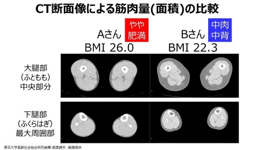 筋肉量の測定により、BMI26.0のAさんは筋肉量が十分でありBMI22.3のBさんは理想的な体型に見えるが“隠れサルコペニア”に陥っていることが判明