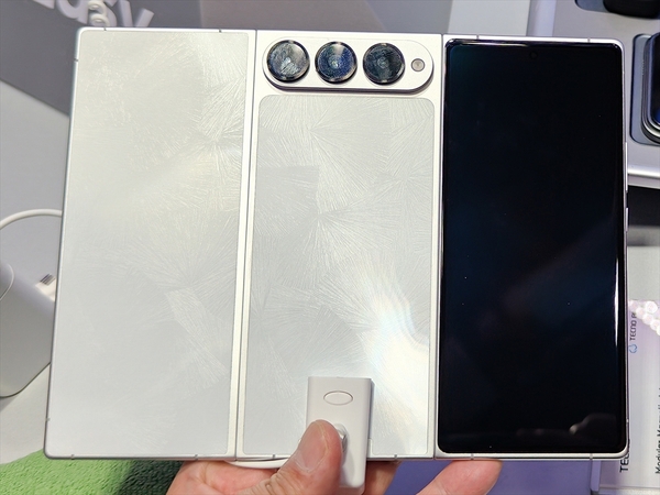これもコンセプトモデルのため詳細スペックは不明。チップセットや画面サイズ、本体サイズなどは一部が公開されている。開いたときの厚さは3.49mmで、3つ折りスマートフォンとしては世界最薄とのこと。また、折りたたんだ時も11.94mmと薄い。開いたときの画面サイズは9.94型、バッテリーは5000mAhクラスを内蔵する。
