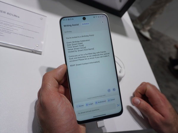 ブースに展示された試作機は、1.5K解像度のAMOLEDディスプレーを搭載していた。AMOLEDでは業界初というナノマトリクスリソグラフィ技術によるアンチグレア処理を施しており、円偏光技術と組み合わせて反射を抑えている。ブルーライト低減やフリッカーフリー、体内時計に配慮した色温度調整(サーカディアン対応チューニング)、暗所での目の負担を軽減する機能なども備える。