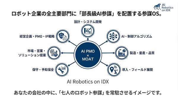 こうした課題を解決するために、「AI Robotics on IDX」では、主要となる7つの部門それぞれに「参謀AI」を配置し、業務を支援するという。