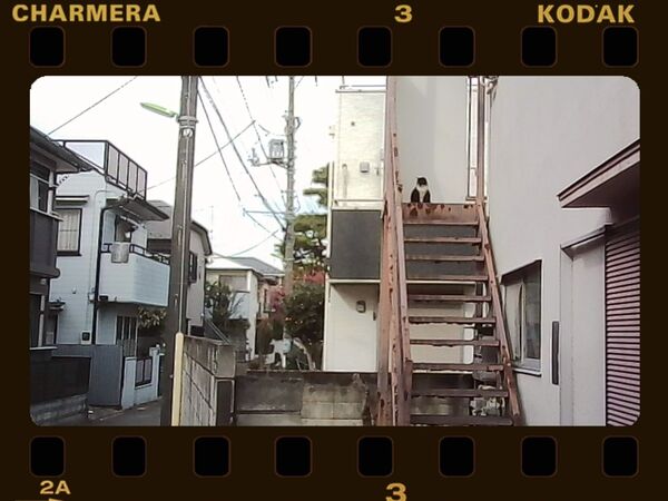 階段の上に白黒の猫がいるのがわかるだろうか。このくらい何気なく撮るのもまたよし。フィルムなフレームも似合う。2026年2月 コダック Charmera
