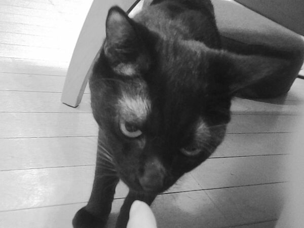 次は白黒フィルターをかけて、指先をくんくんしにきたうちの黒猫あめを。