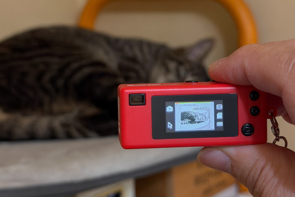 写りはレトロコンデジ。でもここまで小さくて可愛いと画質はどうでもよくなるのが不思議なところで、むしろ適度に画質が悪い方が魅力的に感じるくらいの、指先でつまんで猫と遊びながら撮るのが楽しいおもちゃカメラなのだ。