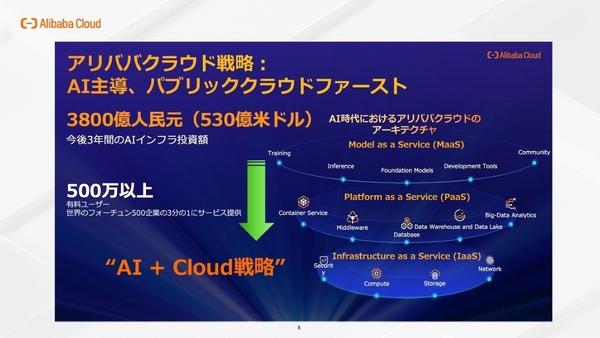 アリババグループでクラウドコンピューティング事業を担うアリババクラウドは、日本でのビジネス展開から10周年を迎える。同社が現在、グローバルで注力するのが「AI+Cloud戦略」であり、今後3年間でAIインフラに530億ドルを投資していく。栗田氏は、「アジア市場をリードするスケーラブルなクラウド環境に加えて、AIを半導体からIaaS、PaaS、MaaS(Model as a Service)、そしてAIアプリケーションまで、フルスタックで提供するのがアリババクラウドの強み」だと強調する。