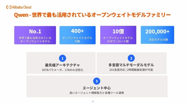 世界で最もダウンロードされているLLM「Qwen(クウェン)」を中心に、オープンウェイトなモデルで存在感を示すアリババクラウド。日本市場でも、スケーラブルなクラウド基盤とあわせてフルスタックなAIソリューションを訴求していく意向だ。