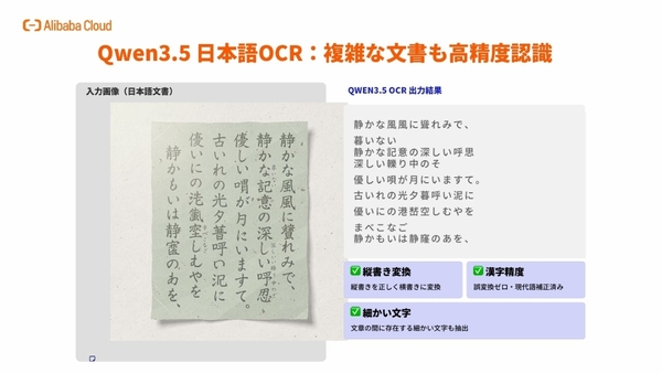 最新モデル「Qwen 3.5」の総パラメータ数は3970億に達し、推論時には170億に抑える仕組みを備えるなど、性能も両立しつつ最先端のアーキテクチャも採用している。マルチモーダルにも対応し、日本語OCRの精度の高さはSNSで話題となったほどだ。